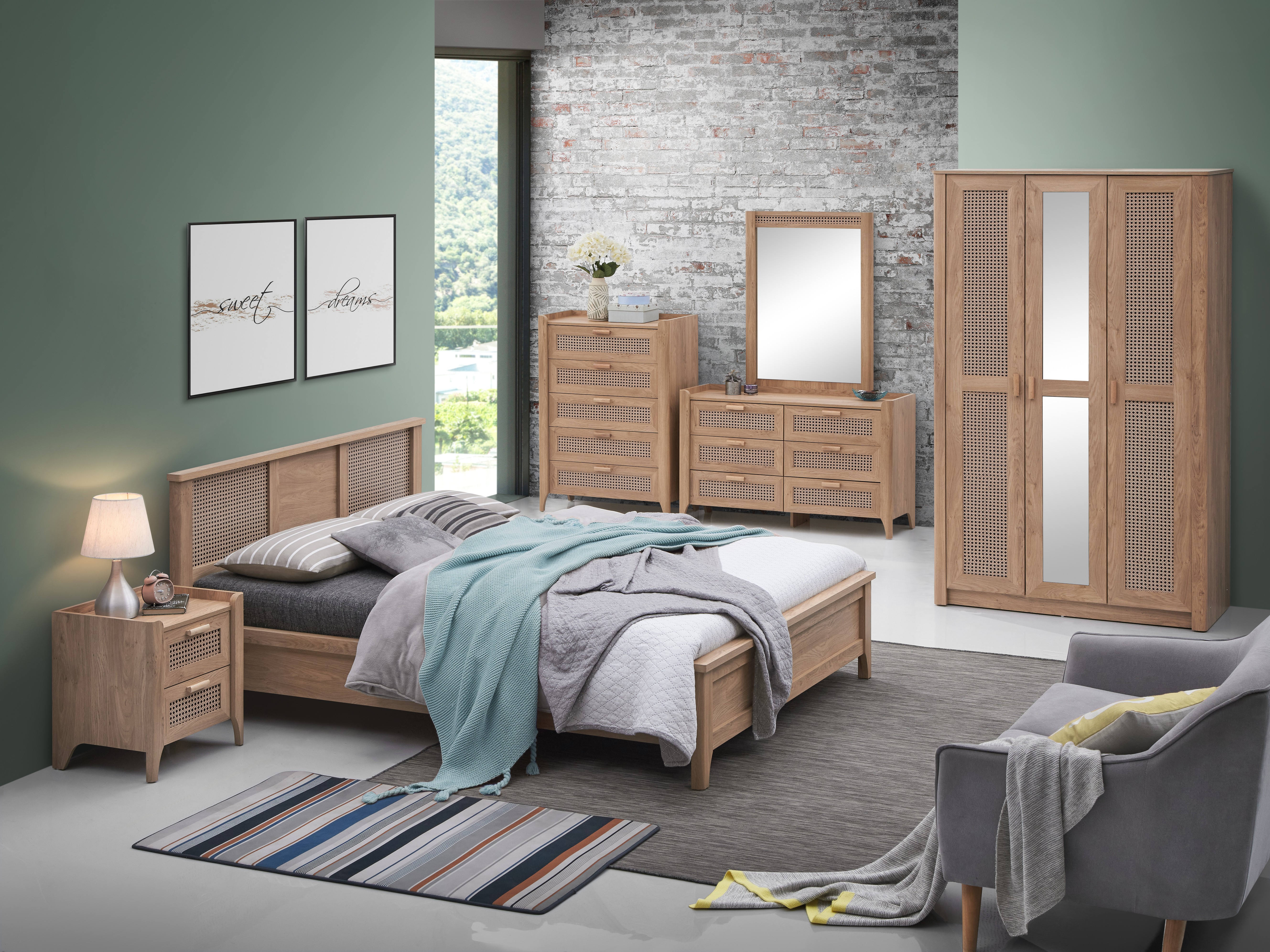 Designed specifically for the European market, this elegantly styled features a sophisticated profile with gracefully curved sides and arched legs. The oak and rattan surfaces laminated providing a natural, textured appearance while maintaining a consistent, high-quality finish suitable for volume production.